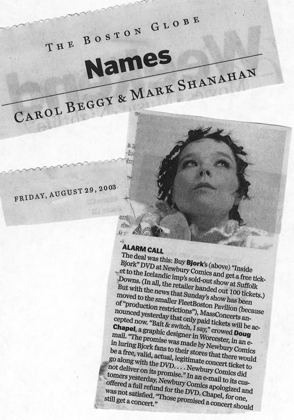 I'm sure that a select few of the Newbury Comics black-clad main office people will be in attendance and cheering their heads off for Bjork (not to mention, opening act the Yeah Yeah Yeahs). Perhaps Newbury Comics ought to consider being MORE HONEST next time when suckering us fans in to buy a DVD and get a free concert ticket: